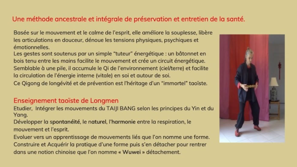 Découvrir la voie naturelle du tao avec cinq mouvements circulaires, arrondis, tel le Dragon s’élève vers le ciel, se relâche dans la terre, scrute l’océan, découvre la perle céleste, s’étire et traverse le ciel.